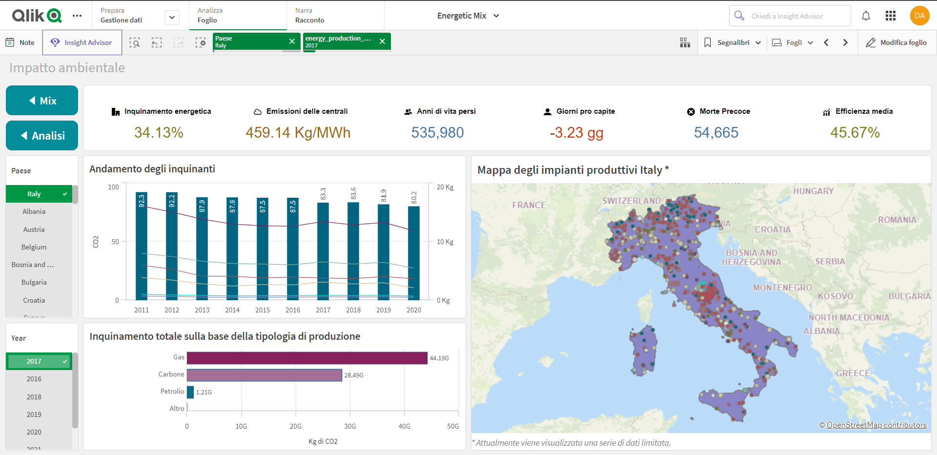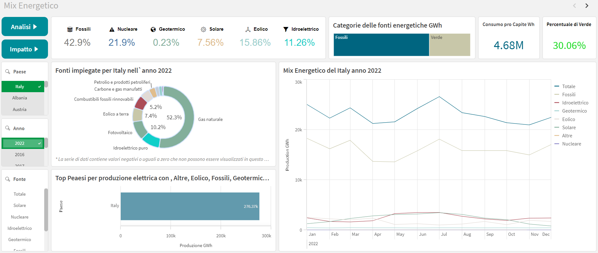 All’interno della dashboard, la parte superiore ospita un KPI multiplo che riporta il valore medio europeo delle sei principali fonti di energia: ‘Fossile’, ‘Nucleare’, ‘Geotermico’, ‘Solare’, ‘Eolico’ e ‘Idroelettrico’. Questo indicatore permette di avere una visione globale e confrontabile del panorama energetico europeo. Inoltre, considerando il nucleare come fonte ‘Verde’, l’indicatore successivo fornisce una stima della quantità di energia prodotta dalle sorgenti fossili e da quelle verdi, offrendo così un’immagine complessiva della qualità del sistema produttivo della nazione selezionata.