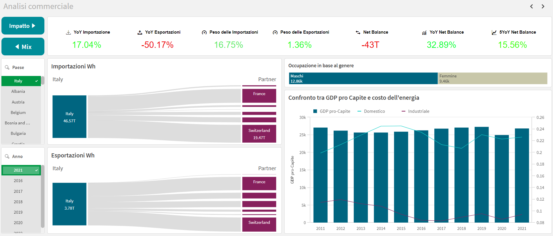 Attraverso il pulsante ‘Analisi’, è possibile accedere alla seconda dashboard che si focalizza sull’analisi commerciale dell’energia, fornendo anche alcuni insights riguardanti gli aspetti socio-economici del paese selezionato.