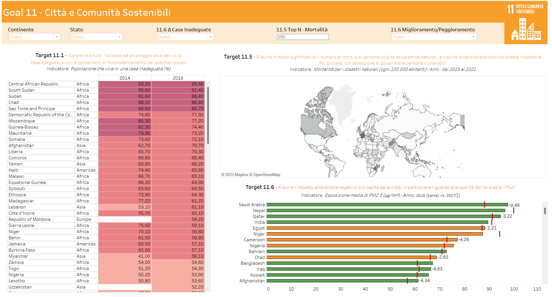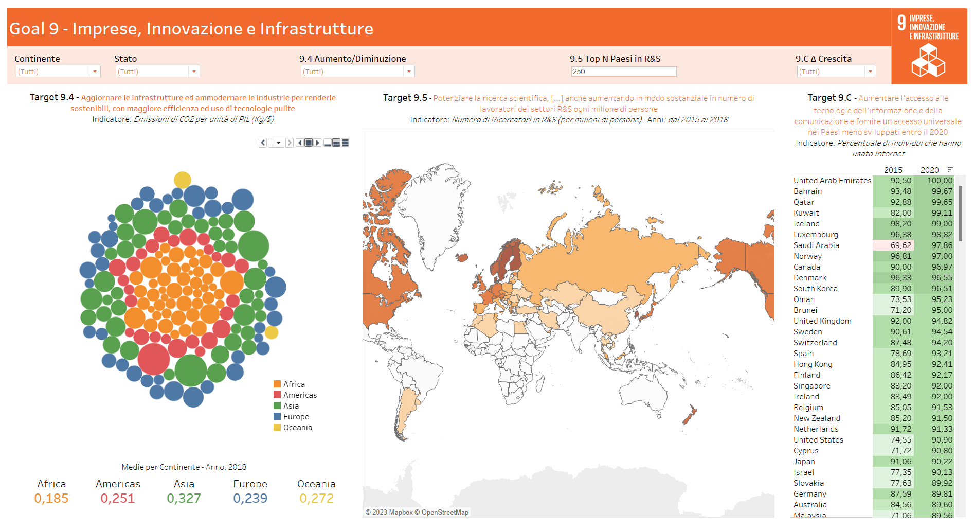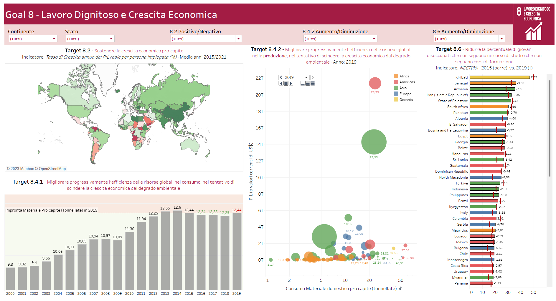 Per poter confrontare lo stato degli indicatori al 2015 con gli ultimi dati disponibili, abbiamo sviluppato tre dashboard in Tableau, ognuna dedicata ad un Obiettivo specifico (Goal 8, Goal 9 e Goal 11).